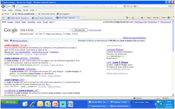 - La recherche documentaire, consistant la plupart du temps à googler le sujet envisagé. Comptez 15'. Voici 1 exemple avec Juste à Temps.