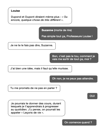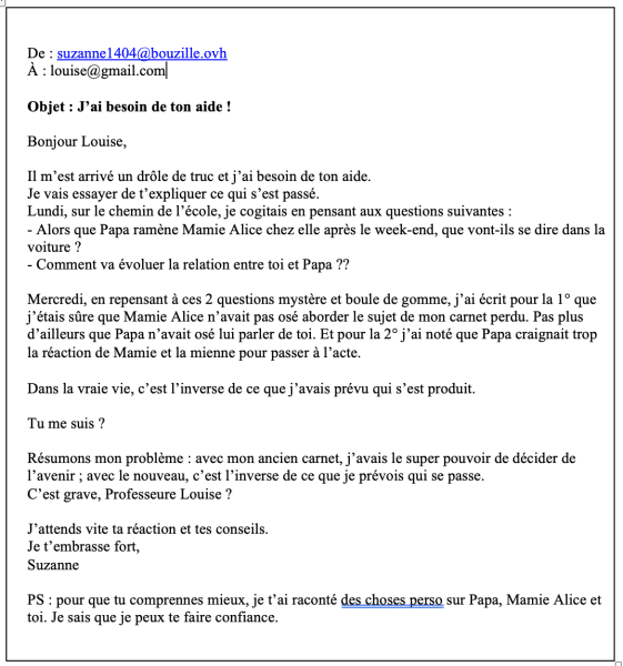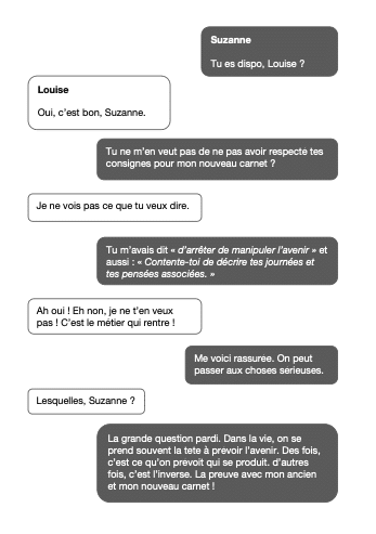 Louise continue : « Oui… et non, Suzanne. Si je t’ai bien compris, dans ton ancien cahier tu ne faisais pas que raconter tes journées, tu essayais aussi de manipuler l’avenir. Avec les conséquences plus ou moins heureuses que ça a entrainées. Tu es d’accord ? »