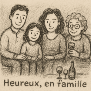 Je me suis lancée dans la description d’une scène familiale : Papa, Mamie Alice, Louise et moi, tous réunis dans le salon en train de prendre l’apéro. Je l’ai appelée « Heureux, en famille ».